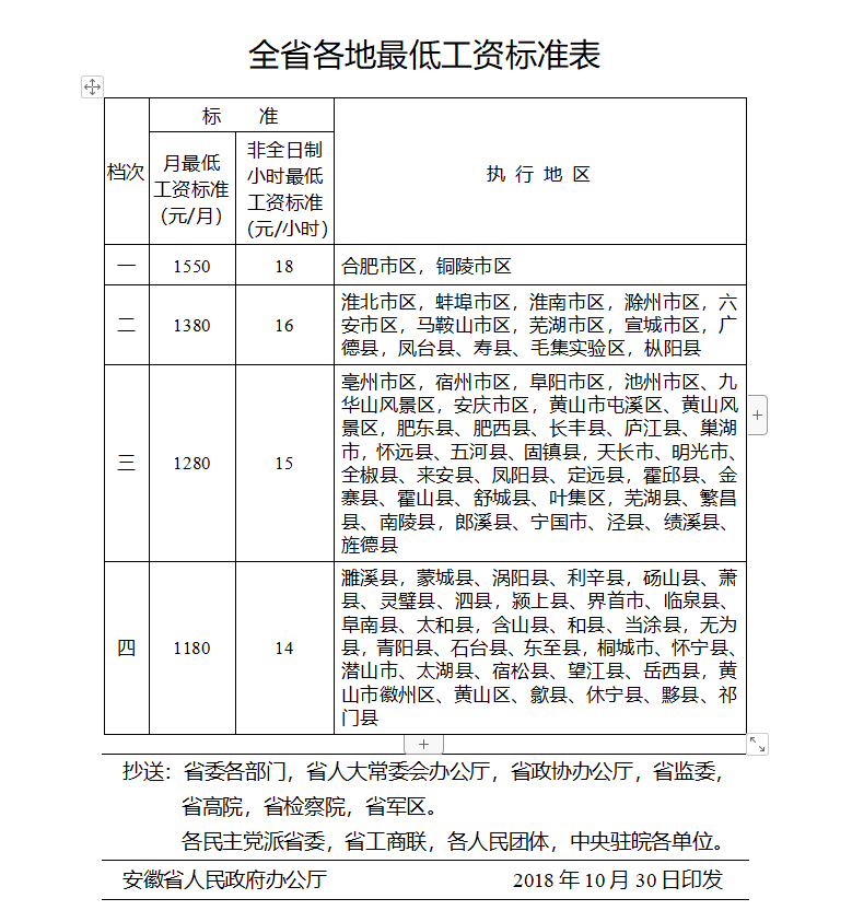 央廣網(wǎng)合肥11月1日消息(記者王利)經(jīng)安徽省人民政府同意,安徽自今天起調(diào)整全省最低工資標(biāo)準(zhǔn)。調(diào)整后,月最低工資標(biāo)準(zhǔn)四個(gè)檔次分別調(diào)整至:1550元、1380元、1280元、1180元。非全日制用工小時(shí)最低工資標(biāo)準(zhǔn)同步調(diào)整,分別為:18元、16元、15元、14元。這是安徽省建立最低工資標(biāo)準(zhǔn)制度以來,第13次調(diào)整最低工資標(biāo)準(zhǔn)。