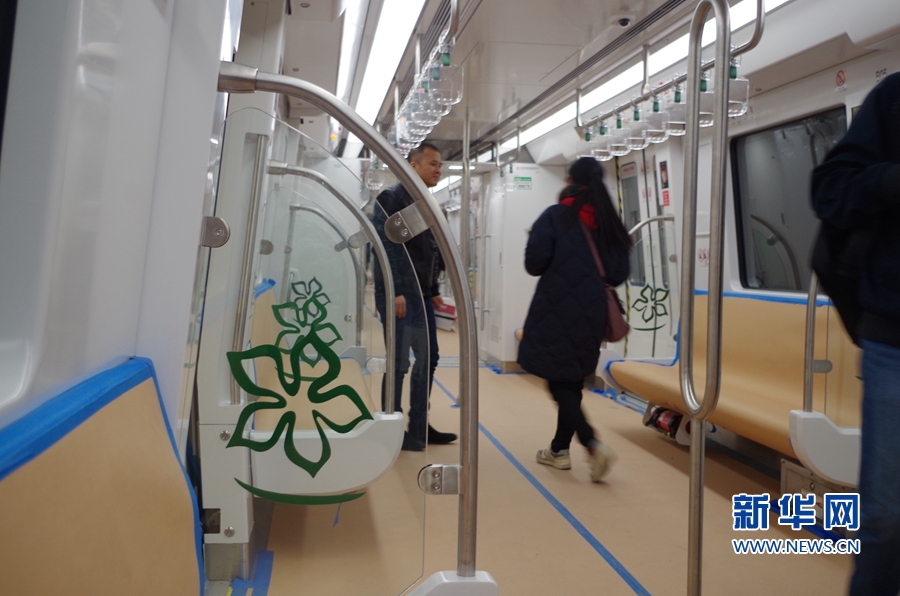福州地鐵2號(hào)線線路設(shè)計(jì)以“綠色榕城 清新福州”為主題,“榕城綠”貫穿于整個(gè)車輛設(shè)計(jì)中。圖為列車座位透明擋板上裝飾的茉莉花圖標(biāo)。新華網(wǎng) 張婷婷 攝