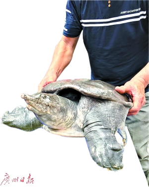 廣州日報訊 昨日10時許,街坊李先生路過廣州市海珠區(qū)大塘東勝新街,見到一個小販在路邊吆喝賣甲魚,這只甲魚體型很大,稱重約55斤,當時想著做善事,李先生花了6000元買下了這只巨型甲魚?墒,他卻不知如何處置,更不知如何放生。