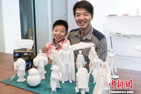 4日,廣州80后父子正在用紙巾制作著名科幻電影《星球大戰(zhàn)》人物模型。 華逸 攝