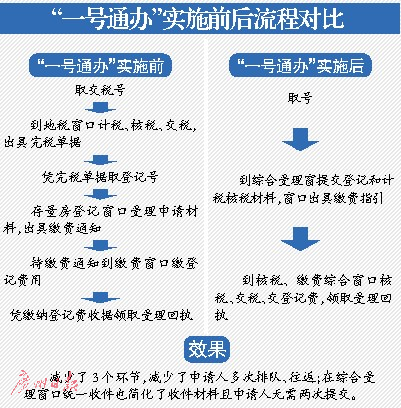 記者昨日在位于珠江新城的廣州市不動(dòng)產(chǎn)登記中心看到,中心一樓張貼的通知顯示,新流程將進(jìn)行三個(gè)調(diào)整:一是實(shí)行全程一號(hào)通辦。申請(qǐng)人(納稅人)只需網(wǎng)上預(yù)約一次,統(tǒng)一在登記服務(wù)大廳咨詢(xún)臺(tái)領(lǐng)取現(xiàn)場(chǎng)號(hào),一號(hào)全程通用于登記、納稅兩項(xiàng)業(yè)務(wù)的辦理。