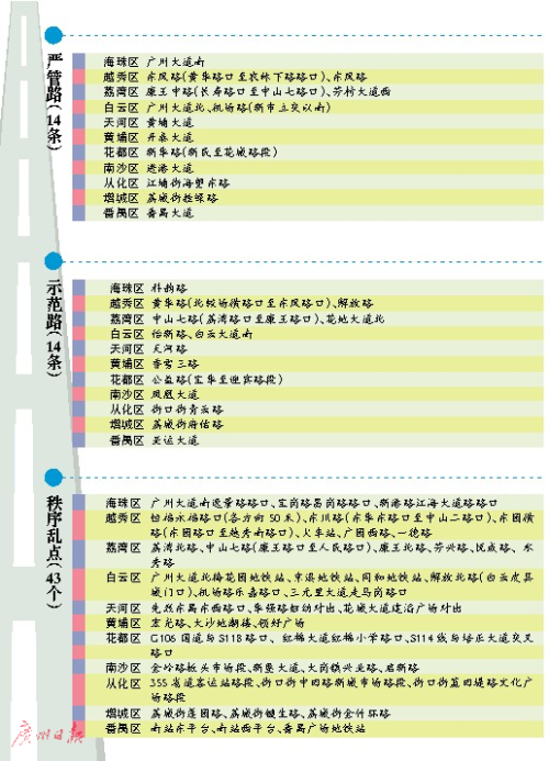 在首批公布的四個(gè)城市整治清單中,廣州公布了全市將集中打造14條“嚴(yán)管路”、14條“示范路”,攻堅(jiān)整治43個(gè)“亂點(diǎn)”。