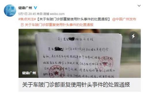 中新網(wǎng)報道: 日前,廣州市天河區(qū)車陂門診部被曝存在“小孩抽血一個針頭兩個人用”的情況。1日晚,廣州市衛(wèi)生和計劃生育委員會通過官方微博做出通報,通報稱,該門診部檢驗科為患兒扎手指采血人員黃某存在有用一個針頭給兩個人采血的行為。天河區(qū)衛(wèi)計局經(jīng)過摸底調(diào)查,排除日常末梢采血技術(shù)操作存在重復(fù)使用針頭的情況。該事件屬檢驗人員操作不當(dāng)?shù)膫案。