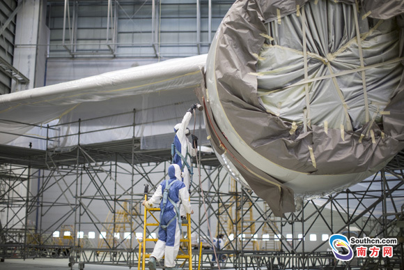 南方網(wǎng)訊 正在首次全面維護(hù)的中國首架A380,進(jìn)入了維護(hù)的最后階段——整機(jī)重新噴漆。筆者25日在廣州飛機(jī)維修工程有限公司車間看見,這個巨無霸“身上”包著一層白膜,局部機(jī)身露了出來,穿著防護(hù)服的工人正在噴漆。