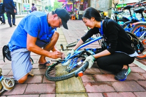 發(fā)現(xiàn)一輛單車的腳架壞了,小藍(lán)俠立即掏出自帶的工具維修。