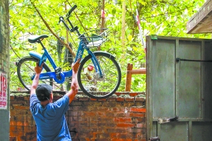 單車獵人發(fā)現(xiàn)圍墻內(nèi)有車堆放,一個(gè)在圍墻里遞出單車,一個(gè)在圍墻外接應(yīng)。
