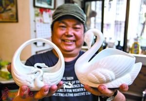 黃昌就保留下來的當(dāng)年白天鵝賓館給貴賓房間放水果用的陶瓷果籃(左)和陶瓷擺件。