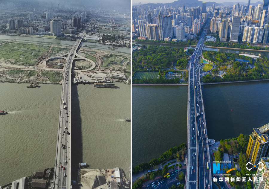 上圖:珠江兩岸老照片;下圖:2017年珠江兩岸航拍圖(拼版照片,3月2日攝)。新華網(wǎng)發(fā) 陳鴻攝