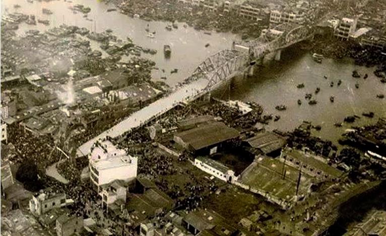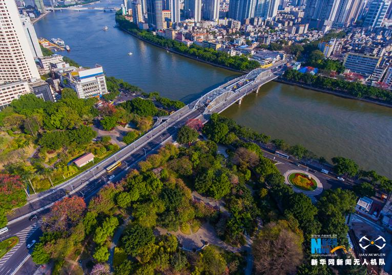 上圖:海珠橋老照片,建于1933年的海珠橋是廣州市第一座跨江大橋,南北兩跨對(duì)稱布置;下圖:2017年海珠橋航拍圖(拼版照片,3月2日攝)。新華網(wǎng)發(fā)陳鴻攝
