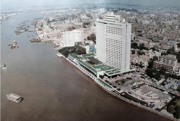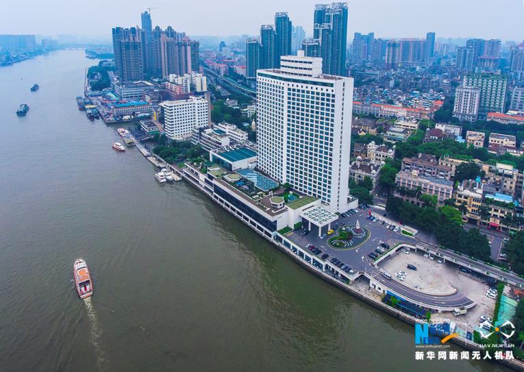 上圖:位于沙面的白天鵝賓館,建于1983年2月,共34層,主樓大廳中庭置一個(gè)以“故鄉(xiāng)水”為主題的嶺南庭園;下圖:2017年白天鵝賓館航拍圖(拼版照片,5月5日攝)。新華網(wǎng)發(fā) 陳鴻攝