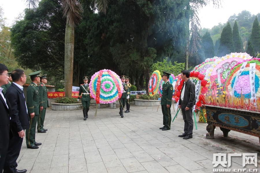圖為警民敬獻花圈。 央廣網憑祥3月29日消息(記者張壘 許大為 通訊員 寧方輝 樓陽)清明節(jié)臨近,3月29日,廣西友誼關邊檢站監(jiān)護中隊黨員官兵、憑祥市綜合保稅區(qū)管委會代表40多人在駐地南山革命烈士陵園舉行祭奠活動。 10時許,邊防官兵向革命烈士敬獻花圈,參加祭奠的代表們列隊,向為新中國解放事業(yè)拋頭顱、灑熱血的革命先烈們脫帽默哀。隨后,全體人員緩步繞行、依次瞻仰了革命烈士紀念碑。 整個活動莊嚴、肅穆,大家接受了一次精神洗禮和思想教育。戰(zhàn)士屈景峰說,這次活動進一步增強了他立足崗位,履職盡責,忠誠奉獻的責任感和使命感。