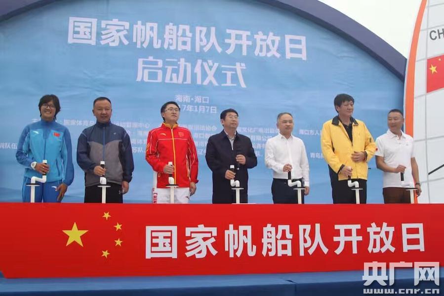 下午15點,海南省人民政府副省長王路宣布活動開幕,并與海南省文化廣電出版體育廳廳長丁暉、國家體育總局水上運動管理中心副主任韓建國、海南省文化廣電出版體育廳副廳長楊毅光,?谑形N、副市長巴特爾、國家帆船隊領(lǐng)隊周長城,里約奧運選手、海南籍運動員黃麗珠等7人共同轉(zhuǎn)動絞盤,升起船帆,共同啟動本次“開放日”活動。