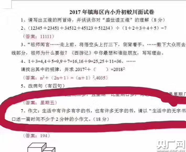 作文題目一出,立即引發(fā)廣泛關(guān)注。有網(wǎng)友馬上貼出了一張《2017年鎮(zhèn)海區(qū)內(nèi)小升初蛟川面試卷》,該試卷第七題就是一個(gè)作文題,題目是這樣的:生活中有許多有字的書,也有許多無字的書,請(qǐng)以“生活中的無字書”口述一篇不少于2分鐘的小作文。