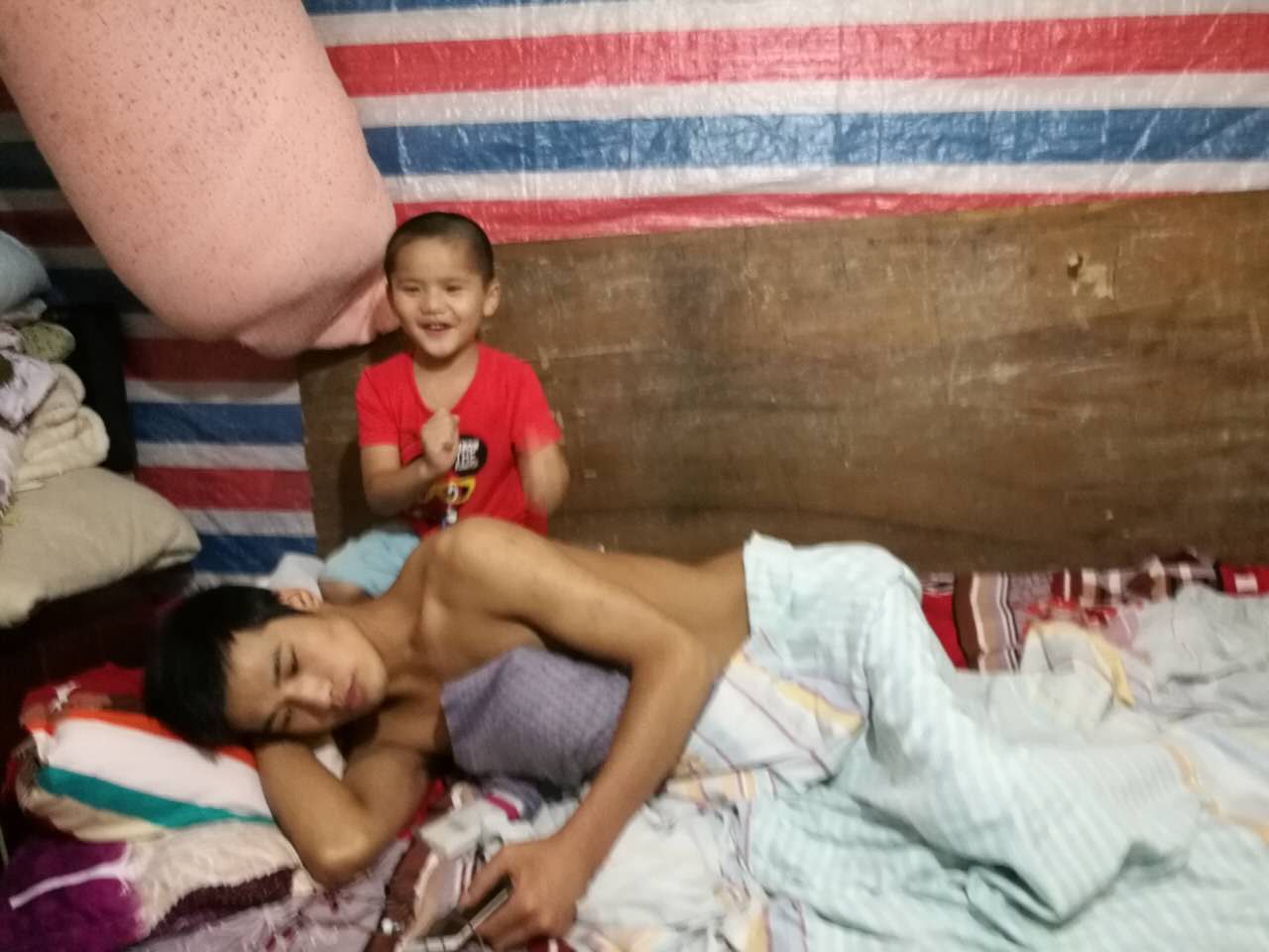 掀開(kāi)門口的布簾,10多平米的屋內(nèi)一覽無(wú)遺:兩張床,一張桌子,一臺(tái)電視機(jī)。呈直角擺放的兩張床,占了屋子的一半,床尾隨意堆放著衣服、箱子和棉被。28歲的劉東側(cè)躺在靠門的床上,一條薄被搭在下半身,隱約可見(jiàn)已經(jīng)蜷縮的雙腿。5歲的劉小羽在另一張床上玩耍,看見(jiàn)來(lái)人,沒(méi)有驚慌沒(méi)有躲閃。