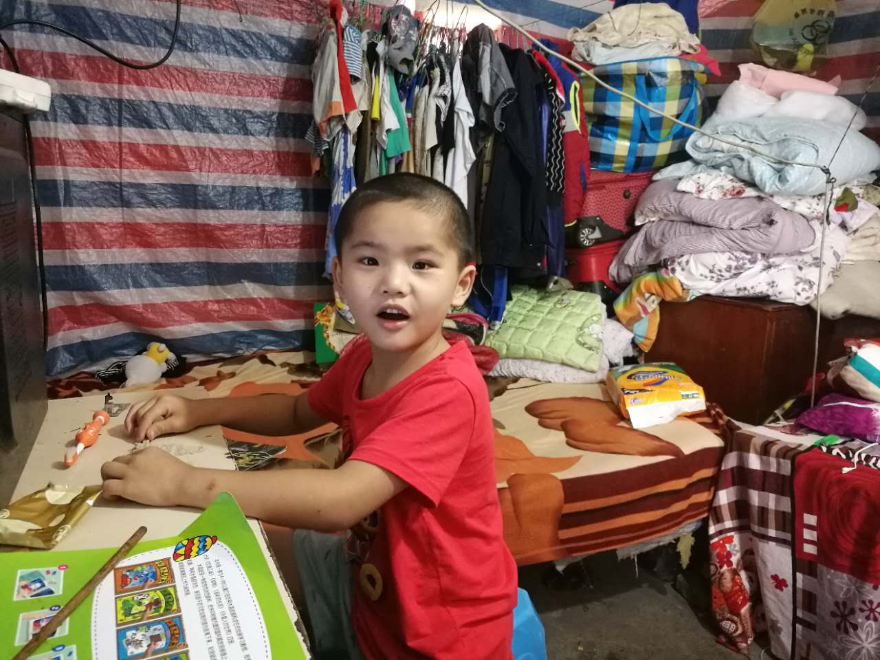 劉小羽穿著紅色的短袖T恤,圓圓的腦袋大大的臉,笑呵呵的在床上翻滾。問(wèn)他叫什么名字,“劉小羽嘛……”他故意拖長(zhǎng)了音,仿佛在說(shuō):你不是知道我名字嗎,為什么還問(wèn)。