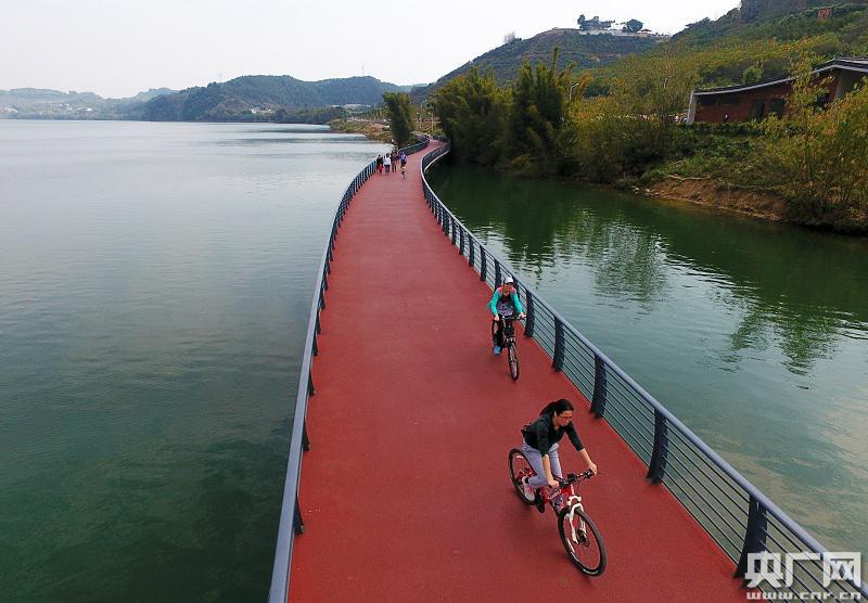 市民在柳州環(huán)江自行車道騎行(央廣網(wǎng)發(fā) 李斌 攝)