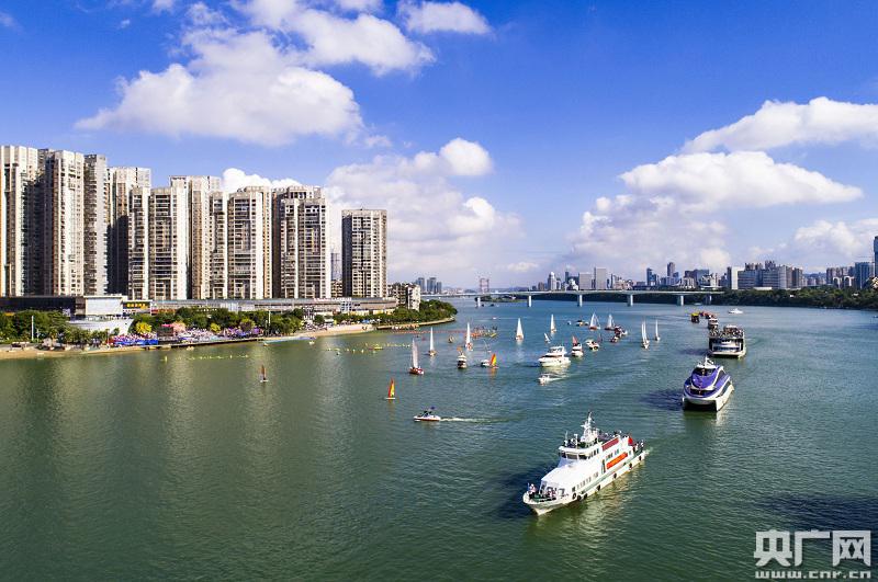 柳州國際水上狂歡節(jié)期間,水上巡游編隊(duì)在柳江上進(jìn)行狂歡巡游(央廣網(wǎng)發(fā) 李斌 攝)
