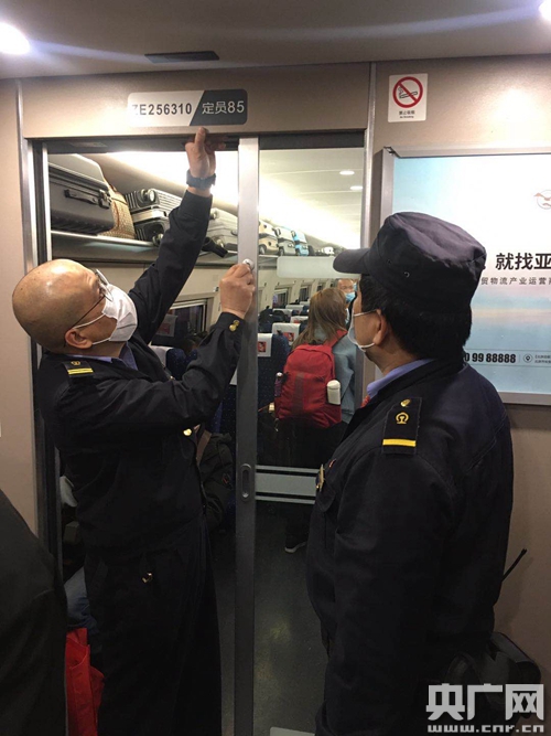 動(dòng)車(chē)組乘務(wù)指導(dǎo)俞培姿在檢查運(yùn)行中動(dòng)車(chē)組的車(chē)門(mén)狀態(tài)(央廣網(wǎng)發(fā) 通訊員供圖)