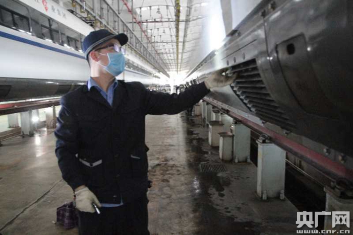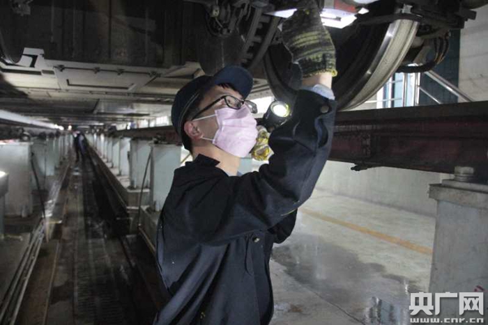 檢修人員正在檢查動(dòng)車(chē)組底部(央廣網(wǎng)發(fā) 通訊員供圖)