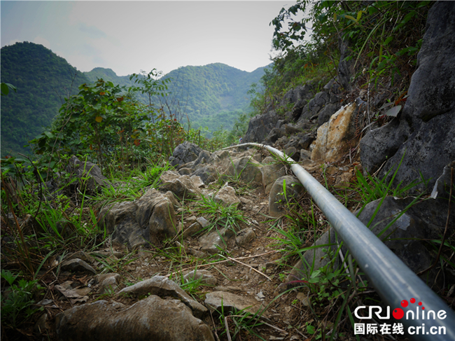 “幸福泉”工程鋪就的水管,用來(lái)將山泉水引到廣西河池市大化瑤族自治縣板升鄉(xiāng)八好小學(xué)。(圖片來(lái)源:國(guó)際在線)