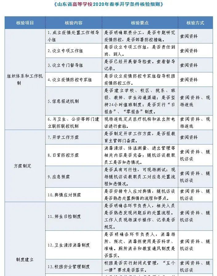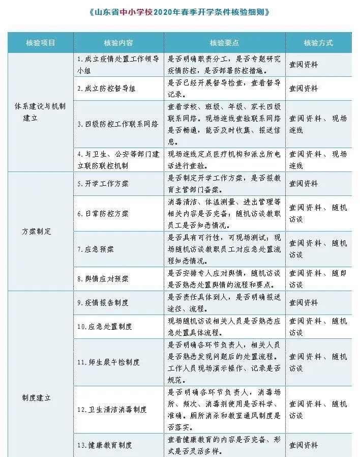 山東省教育廳、省衛(wèi)生健康委、省市場監(jiān)管局聯(lián)合制定《山東省中小學(xué)校2020年春季開學(xué)條件核驗細則》《山東省高等學(xué)校2020年春季開學(xué)條件核驗細則》。要求各級教育部門會同衛(wèi)生健康、市場監(jiān)管部門依據(jù)《核驗細則》指導(dǎo)屬地學(xué)校做好開學(xué)前的各項準備工作,聯(lián)合組建檢查組,以最嚴格的標準,最嚴謹?shù)膽B(tài)度,對屬地學(xué)校進行開學(xué)條件核驗工作,《核驗細則》中任意一項核驗結(jié)果為“否”,即核驗不合格,不得開學(xué)。各級各類學(xué)校要對照《核驗細則》,完善防控責(zé)任體系,細化任務(wù)清單,明確責(zé)任分工,切實做好開學(xué)準備工作,確保廣大師生生命安全和身體健康。