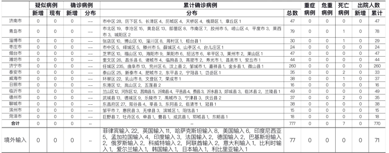 12月1日0時(shí)至24時(shí),山東無(wú)新增本地疑似病例、確診病例。累計(jì)報(bào)告確診病例777例,死亡7例,治愈出院770例。