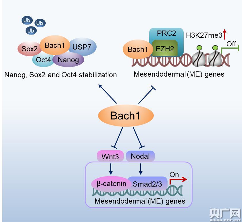 Bach1維持人胚胎干細胞自我更新并抑制干細胞向中胚層和內胚層分化的機制圖(央廣網發(fā) 圖:尹逸柔)