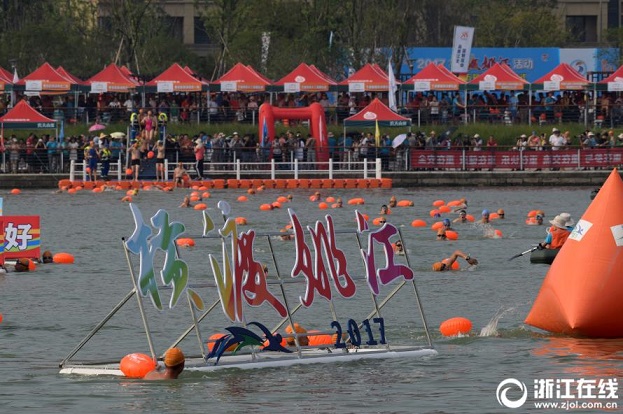 8月6日,2017寧波橫渡姚江活動(dòng)在江北區(qū)雙古渡公園姚江水域舉行,500名游泳選手頭頂烈日,橫渡母親河。(浙江在線拍友 龔國榮 攝)